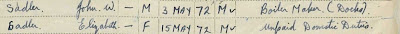 As you can see, Elizabeth Sadler has a date of birth of May 15, 1872. This is the same date as recorded in the civil registration for Elizabeth, the daughter of George Warrener and Mary Ann Kay. It would seem that the Elizabeth Warrener that married John William Sadler is the same Elizabeth Warrener that is the daughter of my 2nd great-grandfather George Warrener.